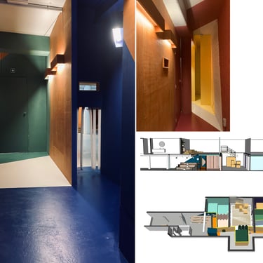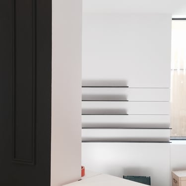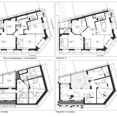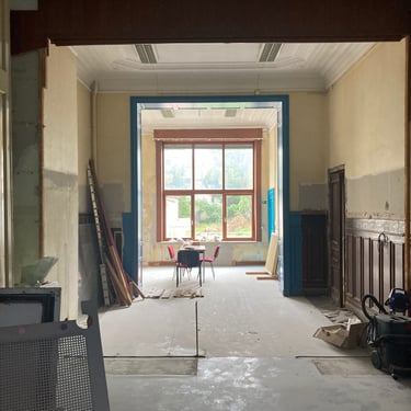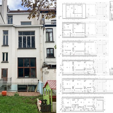 Projet de rénovation et permis d’urbanisme pour une maison de maître à Saint-Gilles : changement d’affectation de l’immeuble, passant d’une crèche à un logement, et division en deux appartements. Suivi client pour l’utilisation de matériaux et de mobilier de réemploi, conception de mobilier sur mesure, et accompagnement dans le choix des couleurs pour la peinture et la menuiserie intérieure.